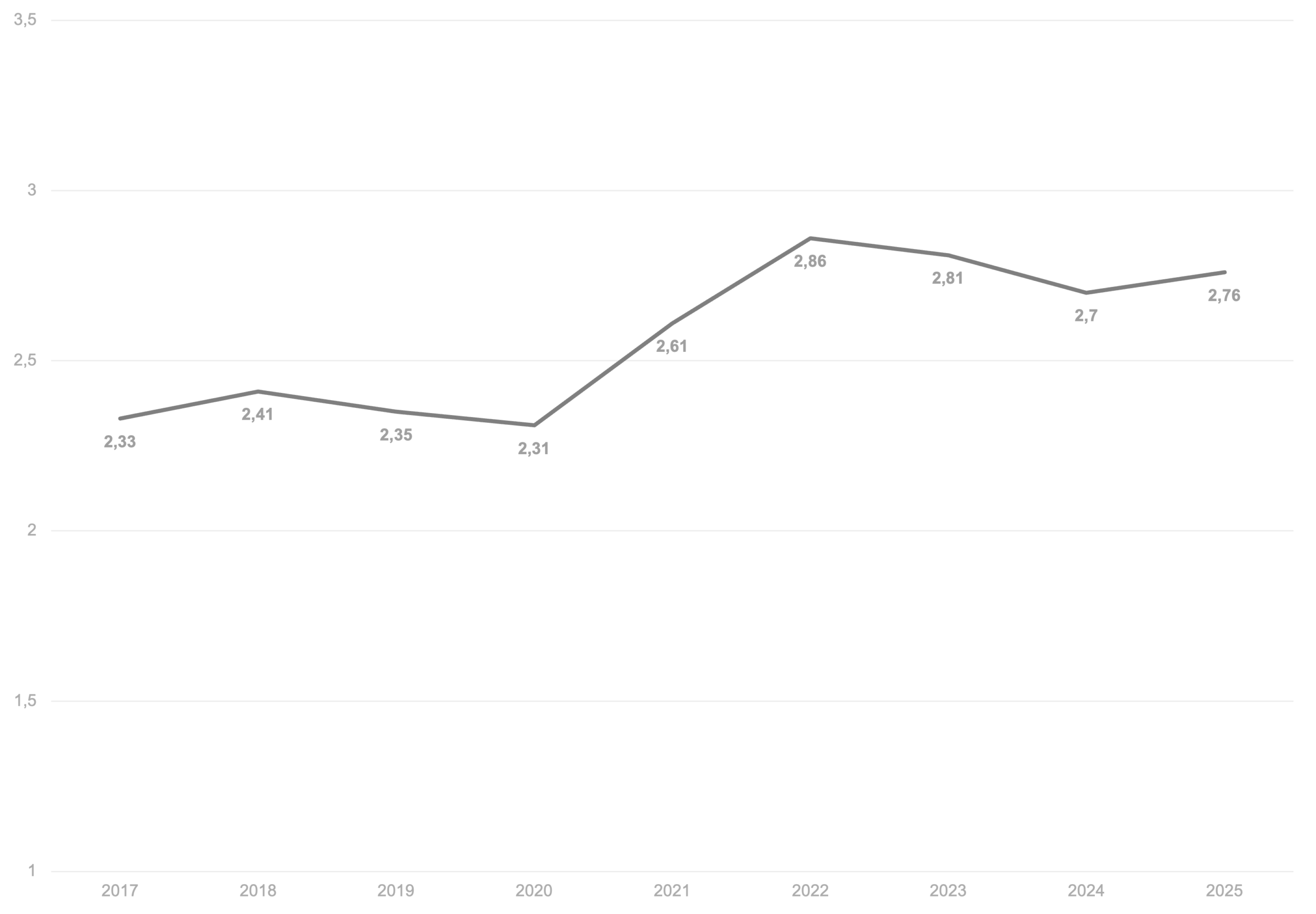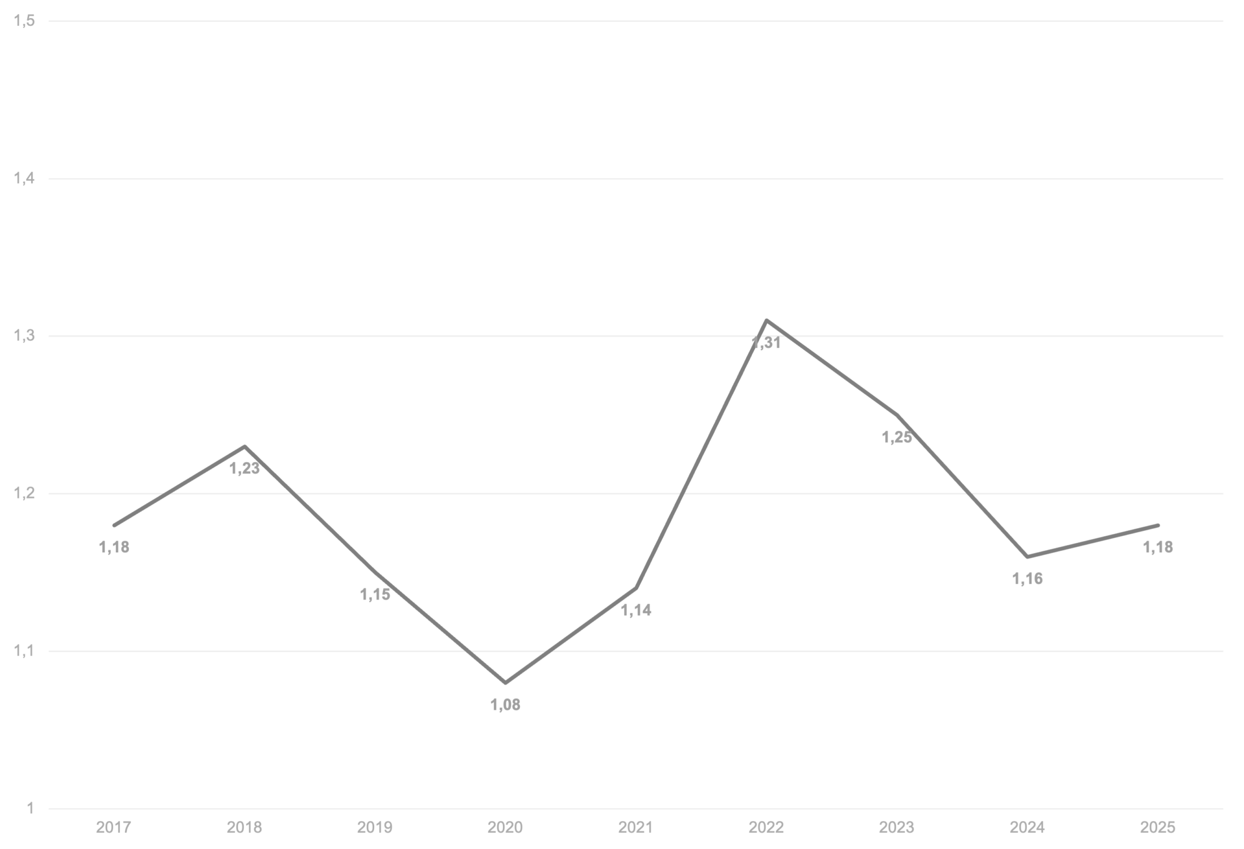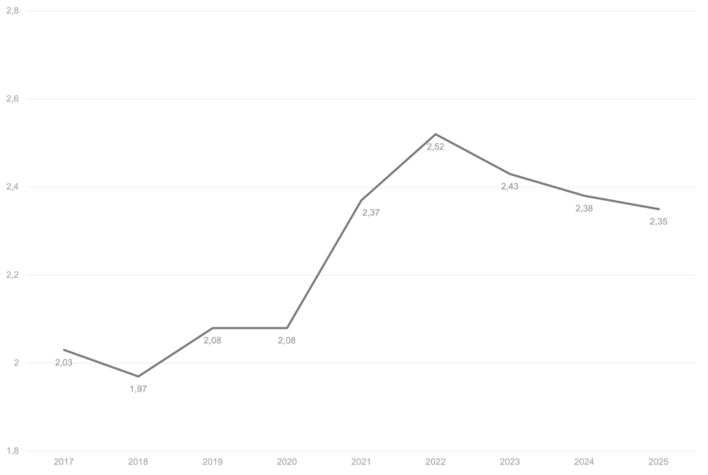 Die Gesamtproduktion entwickelte sich von 2017 bis 2020 stabil. In den Corona-Jahren 2021 und 2022 verzeichnete das Produktionsvolumen ein Wachstum. Anschließend war die Produktion leicht rückläufig, blieb jedoch weiterhin auf Vor-Corona-Niveau. Von 2024 auf 2025 stieg die Produktion um 2,3 Prozent.
