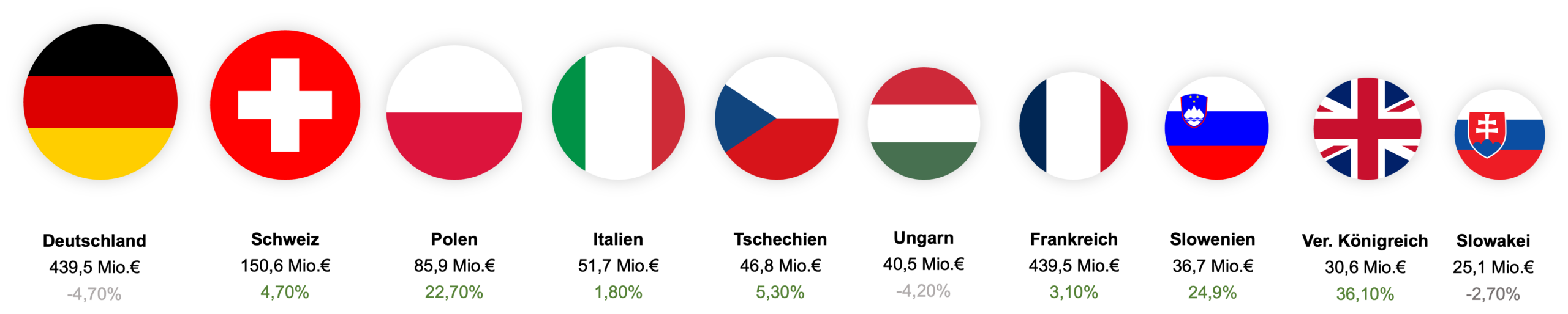 Neben den „sonstigen Möbeln“ haben auch dieses Jahr „Polstermöbel“, „Wohnmöbel“ und „Büromöbel“ die größten Anteile am österreichischen Exportvolumen.  Seit der rückläufigen Entwicklung im Anschluss an die exportstarken Corona-Jahre zeigt sich nun erstmals wieder ein Anstieg. Von 2024 auf 2025 nahm das Exportvolumen um 1,9 Prozent zu.